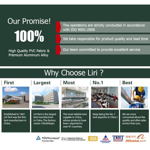 Liri Tent Technology (Zhuhai) Co., Ltd. was established in 1997. Our company is the first professional manufacturer who introduced European advanced tents technology into our own design. Our main products include Modular Aluminium Alloy Structure Tents, Clear Span Tent Structure and Aluminium Alloy Square Pagoda & Summer Gazebo.